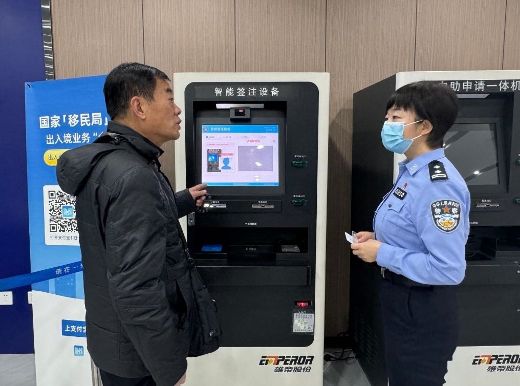 1月11日,在甘肅省蘭州市公安局出入境接待大廳,工作人員引導前來辦理出入境證件的市民使用智能簽注機。新華社記者 任延昕 攝
