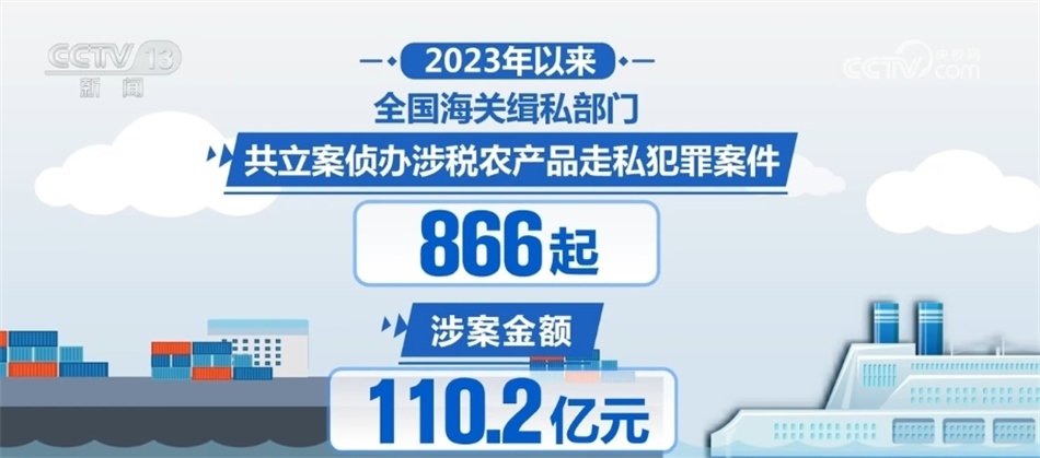 針對(duì)農(nóng)產(chǎn)品走私問(wèn)題,海關(guān)緝私部門加大打擊凍品、煙草、水果、食糖、糧食等農(nóng)產(chǎn)品走私力度,推動(dòng)強(qiáng)化對(duì)運(yùn)輸、倉(cāng)儲(chǔ)、銷售環(huán)節(jié)的清查整治。2023年以來(lái),共立案?jìng)赊k涉稅農(nóng)產(chǎn)品走私犯罪案件866起,涉案金額110.2億元。