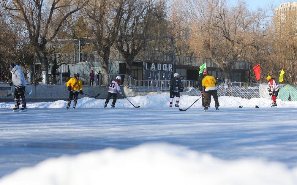 ?2024年1月7日,冰球愛好者在遼寧省沈陽市勞動公園人工湖上打冰球。新華社記者 陳為 攝