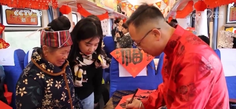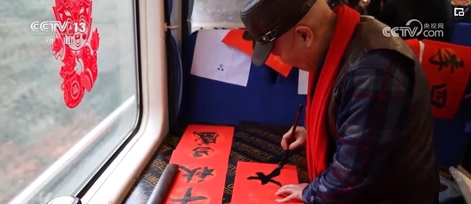 春節(jié)臨近,列車的車廂裝扮一新。鐵路部門還邀請了書法愛好者給旅客們寫春聯(lián)、送福字,為大家送出新春祝福。
