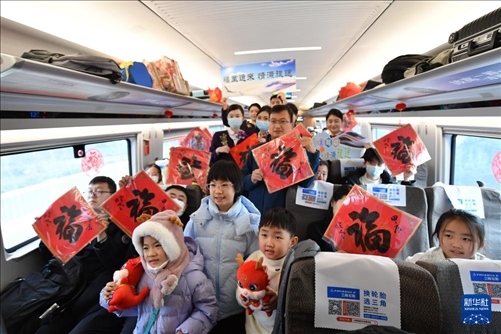 1月26日,在由南京南站發(fā)往太倉(cāng)的G8981次列車上,南京客運(yùn)段的工作人員與收到“?!弊值穆每秃嫌啊P氯A社記者 柳文惠 攝