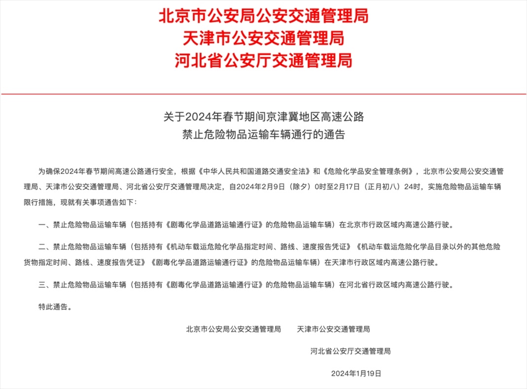 北京市公安局公安交通管理局、天津市公安交通管理局、河北省公安廳交通管理局決定,自2024年2月9日(除夕)0時至2月17日(正月初八)24時,實(shí)施危險物品運(yùn)輸車輛限行措施,現(xiàn)就有關(guān)事項(xiàng)通告如下: