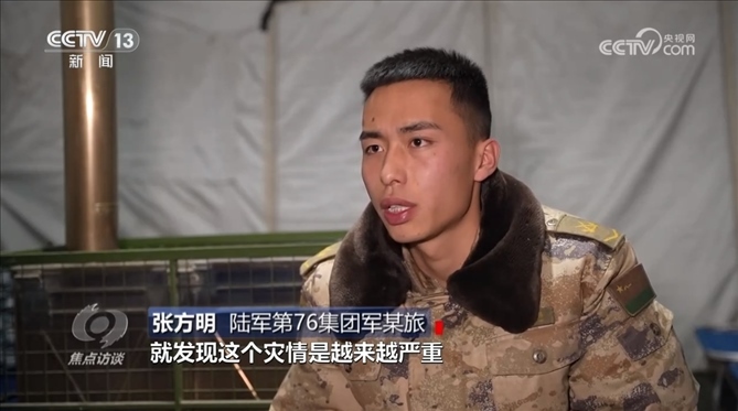 陸軍第76集團(tuán)軍某旅章新禹:“據(jù)我們了解,他家五間房屋全部開裂,家人在院子里面搭了一個帳篷,我們優(yōu)先讓他回去解決自己的事情,然后再返回部隊(duì)?!?/p>