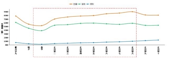預(yù)計春節(jié)期間(含除夕),普通公路日均斷面交通量約7800輛,同比2023年增長約8.2%,如圖4所示。相較于高速公路,普通公路在春節(jié)期間流量較為平穩(wěn),沒有顯著高峰,在節(jié)前明顯下降,除夕達(dá)到最低值,初三以后交通量有所回升。
