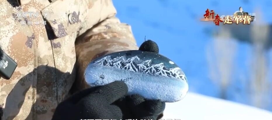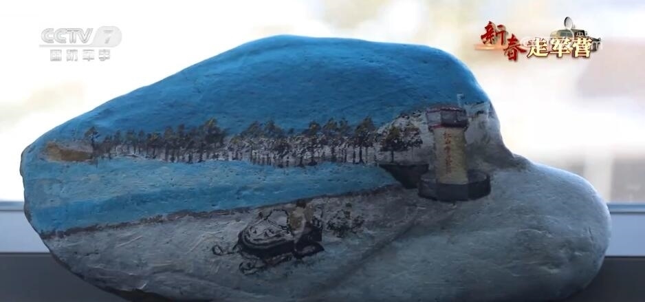新疆軍區(qū)紅山嘴邊防連 段昱恒:我畫(huà)的這塊石頭,這里是我們紅山嘴邊防連的一個(gè)哨樓,這里是我們一起來(lái)的6名新兵,從哨樓出來(lái)準(zhǔn)備去巡邏,前方有冰河,有雪山。在這里我還畫(huà)了一條龍,新的一年是龍年,我也希望大家龍馬精神,見(jiàn)龍皆是福。