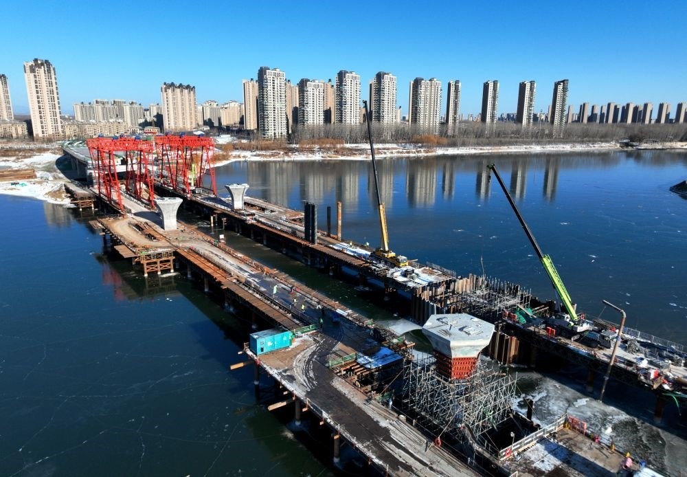 這是廠通路(河北省大廠回族自治縣至北京市通州區(qū))潮白河大橋施工現(xiàn)場(2023年12月21日攝,無人機照片)。新華社記者 王曉 攝