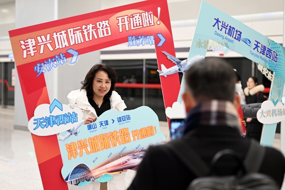 2023年12月18日,旅客在大興機場站拍照留念。當日,津興城際鐵路正式開通運營。新華社記者 李然 攝