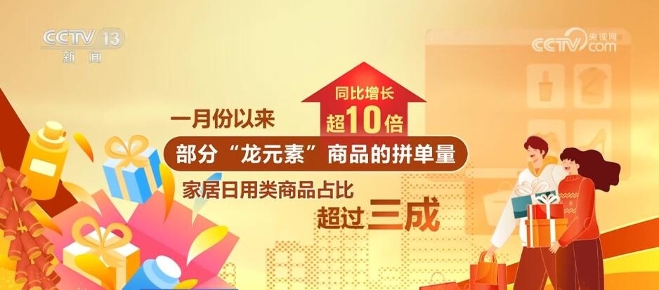 “龍?jiān)亍碑?dāng)仁不讓地成為今年春節(jié)的新“頂流”,不光有龍年的福字對(duì)聯(lián),還有龍年臺(tái)歷、龍寶寶毛絨玩具、龍年紅色內(nèi)衣、龍年中國結(jié)掛飾成為最熱銷的春節(jié)周邊商品前五名。1月份以來,部分“龍?jiān)亍鄙唐返钠磫瘟客仍鲩L(zhǎng)超10倍,其中,家居日用類商品占比超過三成。