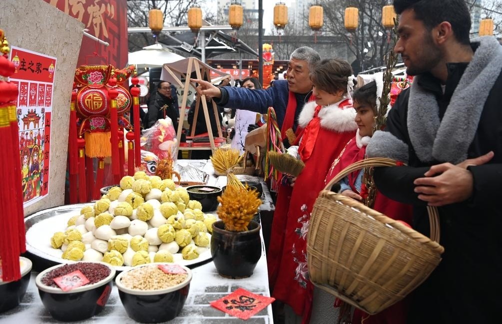 2月2日,在西安永興坊舉行的小年活動(dòng)上,來(lái)自西安各大學(xué)的留學(xué)生在民俗專家的講解下了解小年祭灶所用的物品。新華社記者 劉瀟 攝