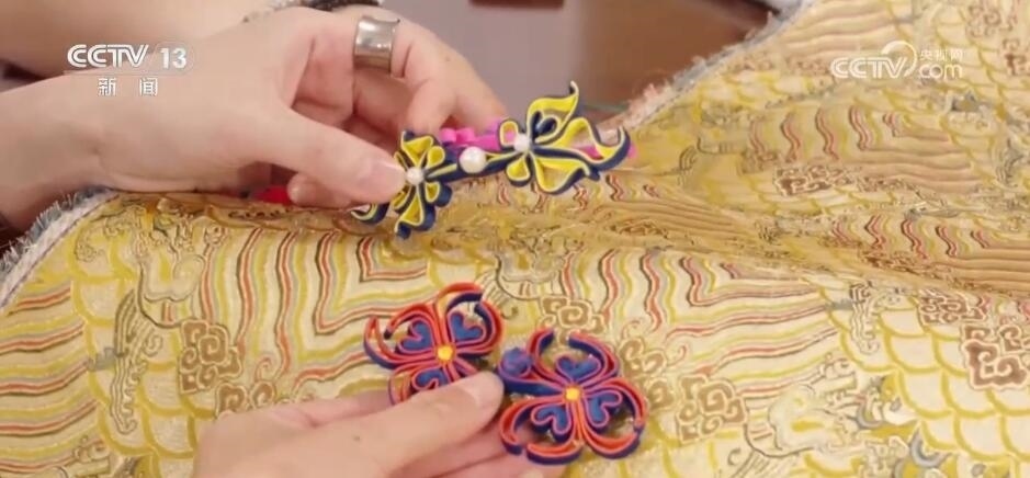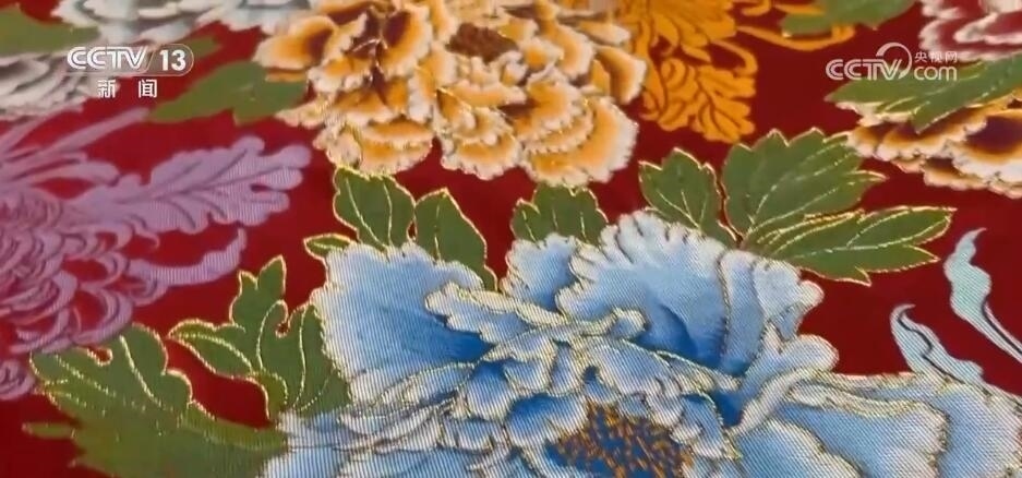 瑞蚨祥中式服裝手工制作技藝傳承人 汪超:這個就是機器(制作)的,你會看到它比較硬,比較板式一點。您看咱們手工的感覺就很軟,而且每一朵花像有生命力一樣。最不一樣看背面,它要不停地換線,不停地去計算,它哪該換線,哪該換色去織造,所以這也是機器織造物沒有辦法替代的很關(guān)鍵的點。