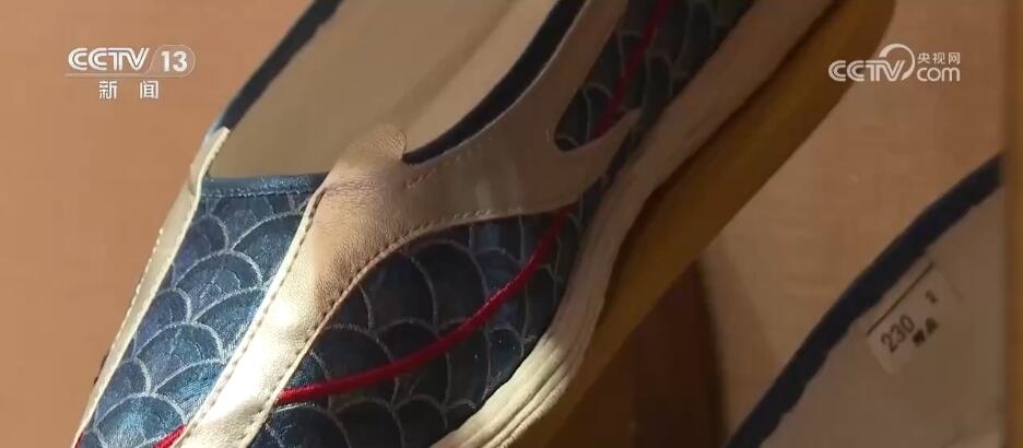 北京內(nèi)聯(lián)升鞋業(yè)有限公司總經(jīng)理 程旭:這款鞋是與《山海經(jīng)》聯(lián)名,它每一片龍的龍鱗是可以打開。這款鞋我們?nèi)ツ旰凸蕦m聯(lián)名推出的一款漢服鞋,你看這個叫龍角鞋,還有龍的觸角,有龍鱗,還有龍的須子,搭配這種漢服非常別致、非常時尚。