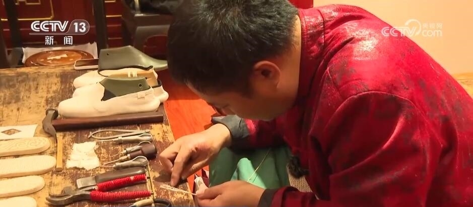 內(nèi)聯(lián)升千層底布鞋制作技藝第五代傳承人 徐文浩:手工納的底用的是一種麻繩,像機器納底用的就是棉線。這個麻繩我們也是手工搓出來的,機器走不了這種不規(guī)矩的線。這個麻繩在鞋底里整個會膨脹,會把所有的布鎖在一起,咱們穿的時候,說第一層鞋底磨破了,麻繩都磨斷了,它不會散,它只會越磨越薄。像這種機器納的,這個線如果說磨斷了,這個底一層一層就開始脫落了。