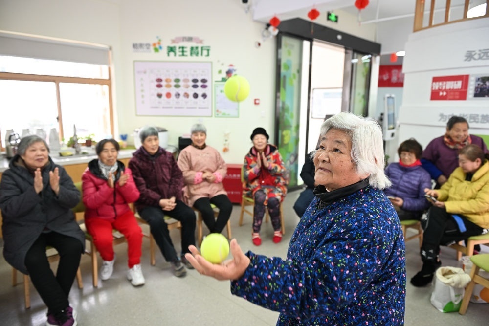 在江蘇省常州市天寧區(qū)茶山街道富強新村社區(qū)黨群服務中心,老人即興表演才藝(2024年1月9日攝)。常州市積極構(gòu)建15分鐘居家養(yǎng)老服務圈,建有鎮(zhèn)(街道)綜合性養(yǎng)老服務中心62家,實現(xiàn)街鎮(zhèn)全覆蓋。新華社記者 季春鵬 攝