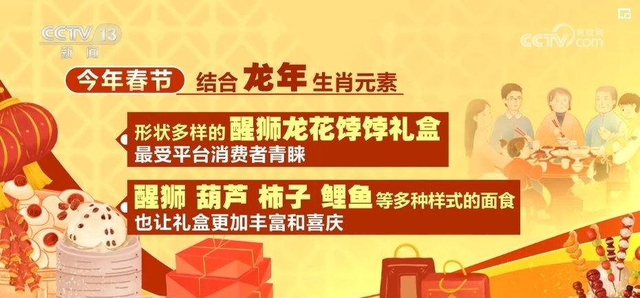 不僅如此,2024年春節(jié),結(jié)合龍年生肖元素,形狀多樣的醒獅龍花餑餑禮盒最受平臺(tái)消費(fèi)者青睞。而醒獅、葫蘆、柿子、鯉魚(yú)等多種樣式的面食,也讓禮盒更加豐富和喜慶。