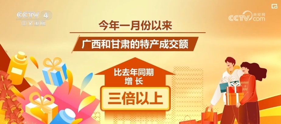 各大商場(chǎng)、超市、線上平臺(tái)均迎來(lái)銷(xiāo)售高峰。某購(gòu)物平臺(tái)數(shù)據(jù)顯示,2024年1月份以來(lái),廣西和甘肅的特產(chǎn)成交額比同比增長(zhǎng)了三倍以上。廣西的砂糖橘、羅漢果茶,甘肅的蓋碗茶、百合干格外火熱。河南、天津、貴州等10個(gè)省份的特產(chǎn)成交額同比增長(zhǎng)了一倍以上。