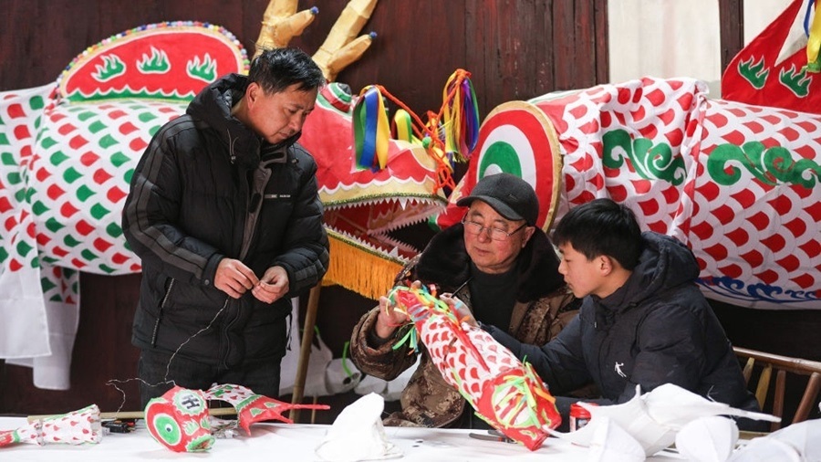 2024年2月6日,安徽省黃山市歙縣瞻淇村的魚燈制作技藝傳承人汪觀海(中)在制作魚燈。新華社發(fā)(樊成柱 攝)