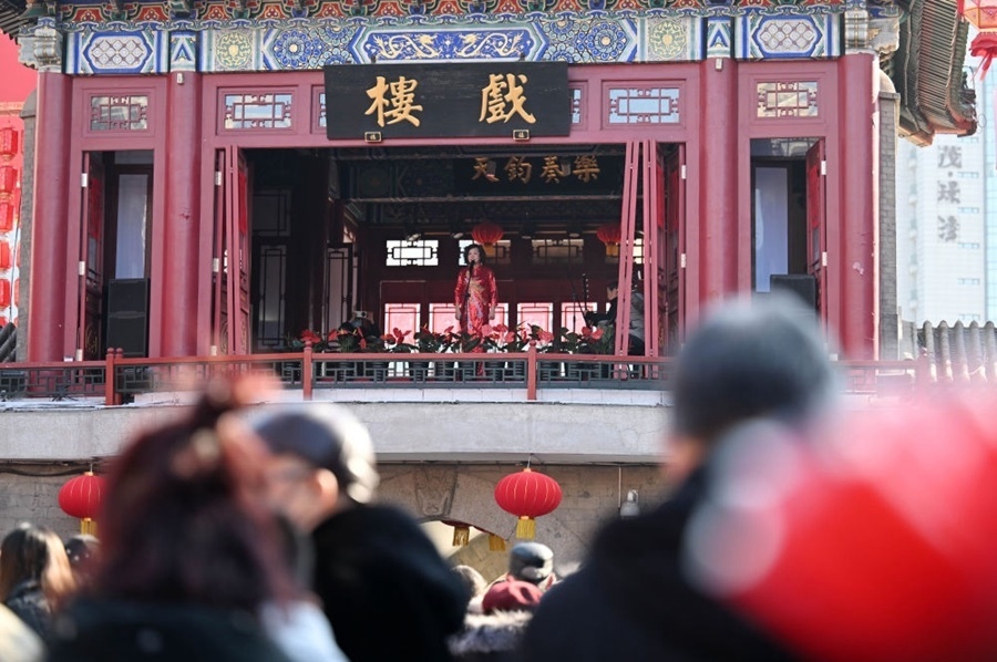 2024年2月10日,游客在天津古文化街觀看演出。新華社記者 趙子碩 攝