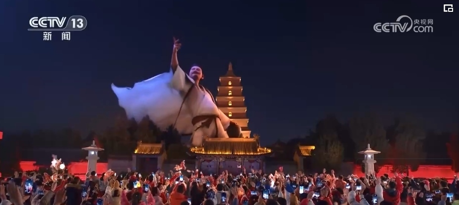 除夕當(dāng)晚9時(shí),西安分會(huì)場(chǎng)《山河詩(shī)長(zhǎng)安》篇章的“打開(kāi)方式”讓人眼前一亮。在科技助力下,“詩(shī)仙”李白跨越歲月長(zhǎng)河“穿越”而來(lái),在煙火璀璨中,隨著熙熙攘攘的人群一起走進(jìn)西安城墻永寧門,走入千年后的耀眼長(zhǎng)安。