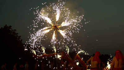生龍活現(放煙花):登場的兩條龍,點燃提前放置的焰火筒,在龍珠的帶領下,形成“口中火”“脊上火”“腹中火”“導引火”的立體方陣,熱烈多彩。