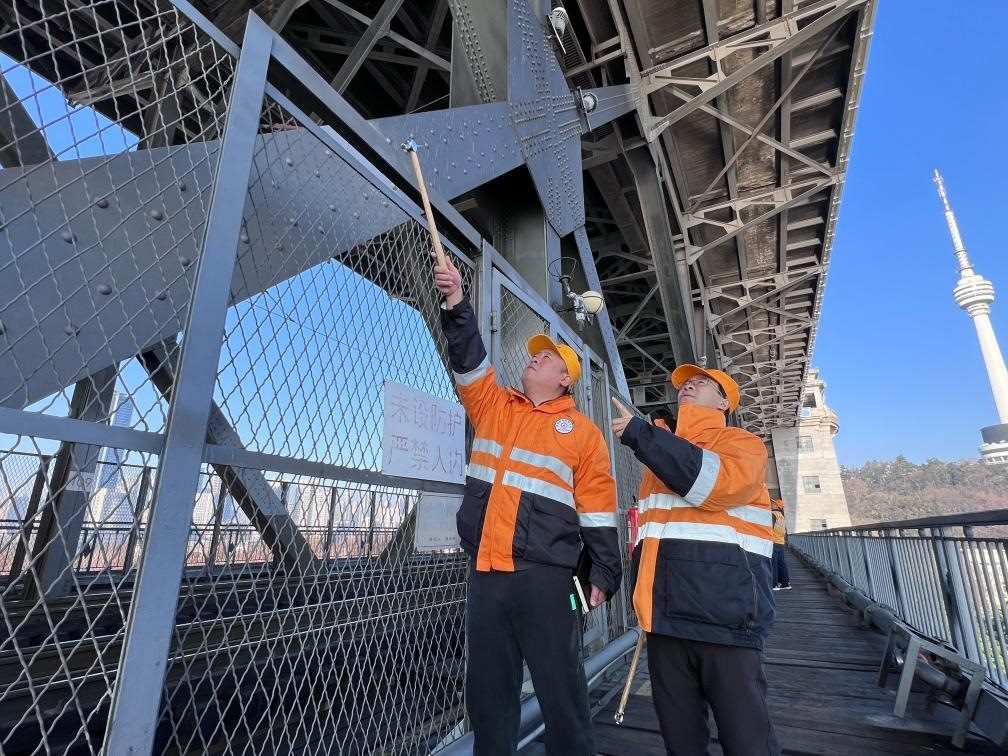 2月12日,武漢長(zhǎng)江大橋橋梁車(chē)間員工陳卿明(左)、趙福武在武漢長(zhǎng)江大橋上巡檢。(朱叢蓓 攝)