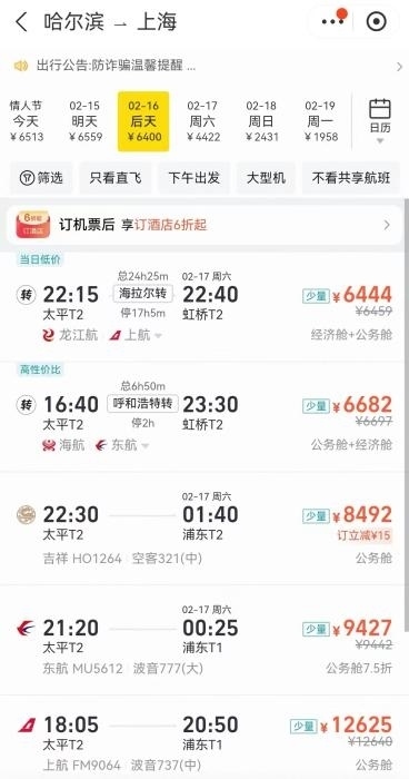 中新網(wǎng)2月16日電(中新財經(jīng)記者 謝藝觀)“火車票沒搶到,機票也沒經(jīng)濟艙的了”“回滬機票價格漲了3倍”“回京只剩高價公務(wù)艙”……