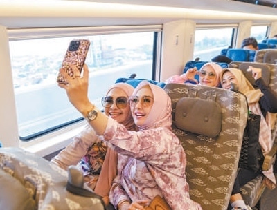 乘客在行駛中的雅萬高鐵車廂內(nèi)拍照。作為“一帶一路”倡議和中印尼兩國務(wù)實合作的標志性項目,雅萬高鐵全線采用中國技術(shù)、中國標準。新華社記者 徐 欽攝