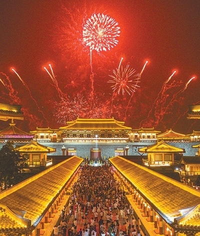 游客們在湖北省襄陽市唐城景區(qū)看煙花秀。當?shù)嘏e辦的戲曲文化藝術(shù)節(jié)吸引了眾多省內(nèi)外游客前來,拉動當?shù)芈糜谓?jīng)濟。據(jù)統(tǒng)計,2023年國內(nèi)出游人次達48.91億,國內(nèi)游客出游總花費4.91萬億元。楊 東攝(影像中國)