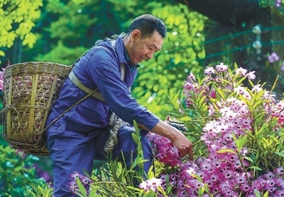 四川省瀘州市合江縣福寶鎮(zhèn)種植基地,村民在采摘金釵石斛鮮花。各地發(fā)展綠色生態(tài)農(nóng)業(yè),積極打造特色農(nóng)產(chǎn)品優(yōu)勢品牌,助推鄉(xiāng)村全面振興。李貴平攝(影像中國)