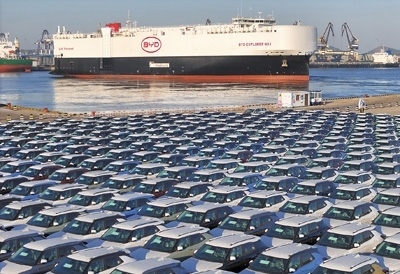 中國首艘由國內(nèi)船企建造、專門用于國產(chǎn)新能源汽車出口的汽車運輸船“比亞迪開拓者1號”搭載新能源汽車從山東煙臺港啟航。2023年,中國新能源汽車產(chǎn)銷量均突破900萬輛,其中出口120.3萬輛,同比增長77.6%,成為經(jīng)濟高質(zhì)量發(fā)展中的一抹亮色。唐 克攝(影像中國)