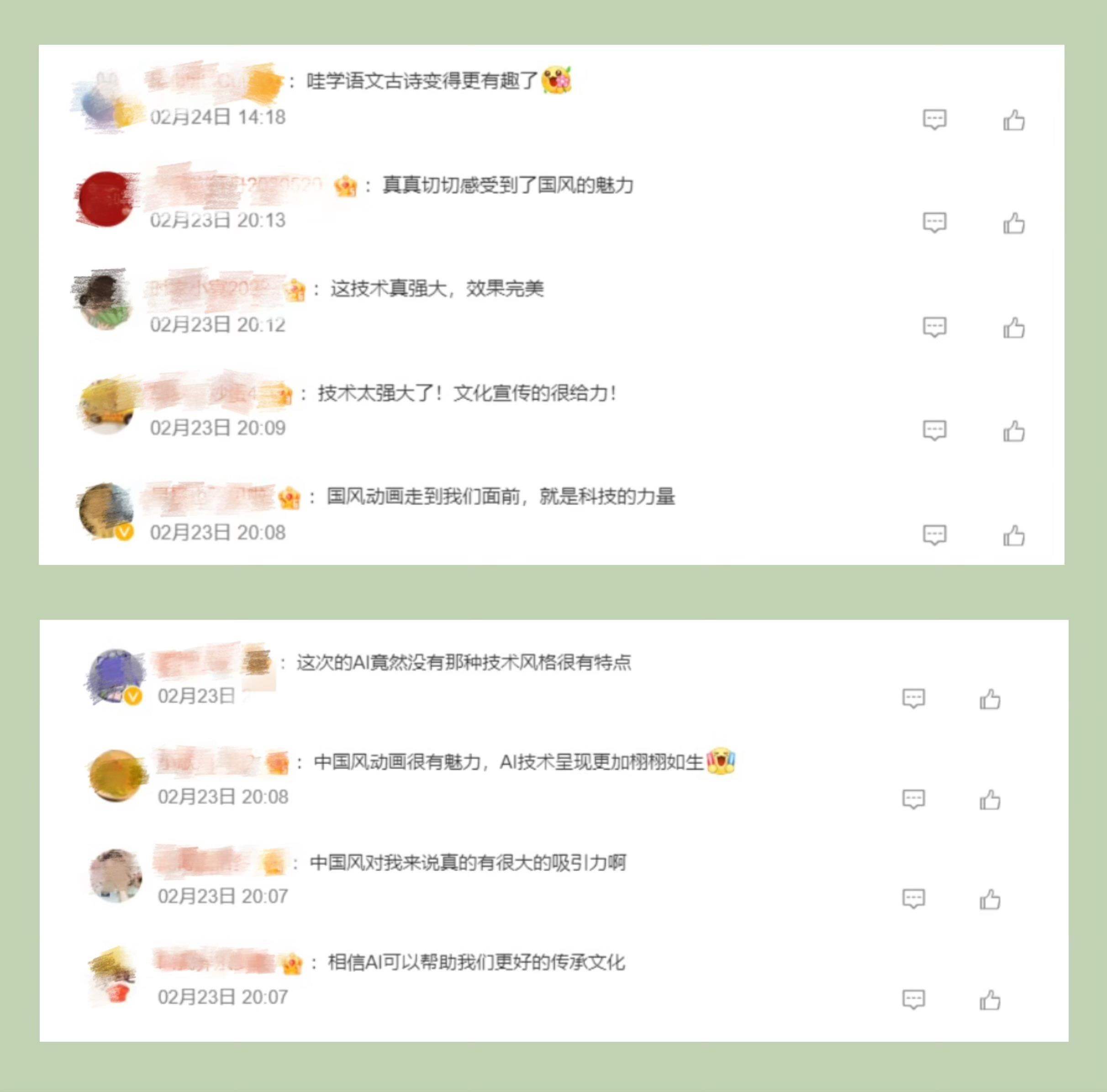 節(jié)目探索詩畫融通的國風動畫片新呈現(xiàn),讓廣大青少年進一步加深了對中國經(jīng)典詩詞的理解和喜愛?!癆I”“總臺”“千秋詩頌”等成為網(wǎng)友熱議高頻詞。截至2月27日20:00,話題#千秋詩頌#閱讀量超791萬次。網(wǎng)友紛紛留言:“看到這個系列片,我真的深深感受到了中國傳統(tǒng)文化的深厚底蘊。這些古詩詞深入骨髓,流淌在我們的血液中,是我們國家的文化符號”“以AI為媒,央視制作的這部國風動畫片傳承了經(jīng)典,喚醒了古韻的新生命”“唯美的畫面讓人動容,用視覺的形式了解《別董大》這一首古老的詩歌更別有一番韻味”“這種科技與動畫片的結合,恰好是現(xiàn)在小朋友們和大朋友們所需要的”。