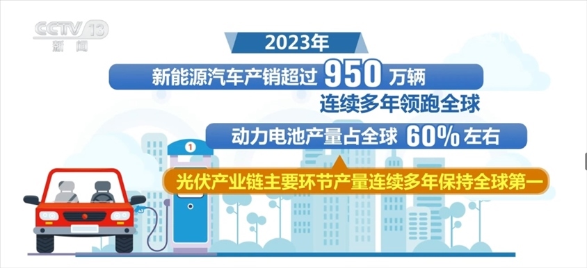 2023年,我國高技術(shù)制造業(yè)、裝備制造業(yè)增加值占規(guī)模以上工業(yè)增加值比重分別達到15.7%和33.6%。新能源汽車產(chǎn)銷超過950萬輛,連續(xù)多年領跑全球,動力電池產(chǎn)量占全球60%左右,光伏產(chǎn)業(yè)鏈主要環(huán)節(jié)產(chǎn)量連續(xù)多年保持全球第一。