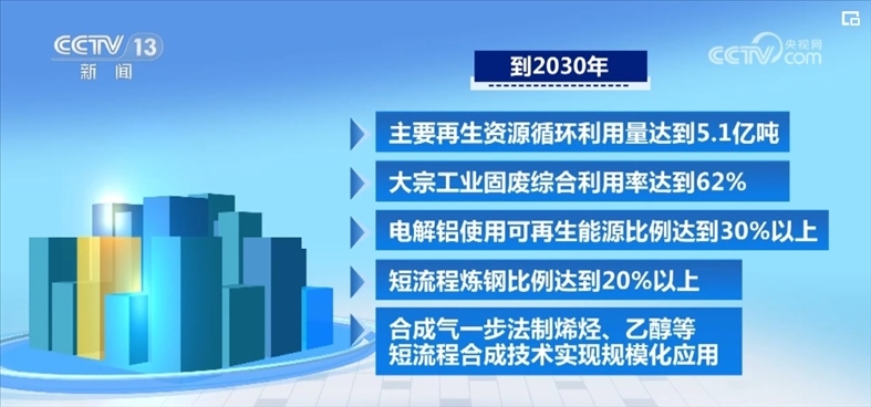 《指導意見》提出,到2030年,主要再生資源循環(huán)利用量達到5.1億噸,大宗工業(yè)固廢綜合利用率達到62%,電解鋁使用可再生能源比例達到30%以上,短流程煉鋼比例達到20%以上,合成氣一步法制烯烴、乙醇等短流程合成技術(shù)實現(xiàn)規(guī)?;瘧?。