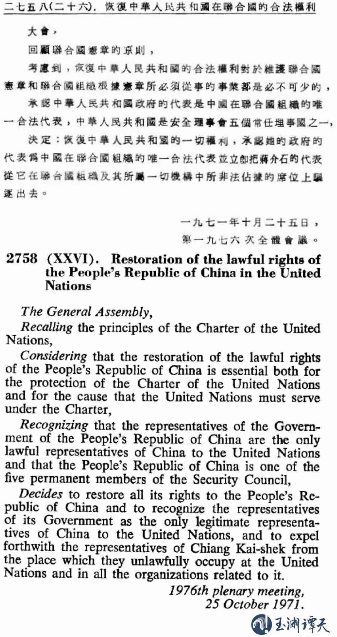 1971年,多國(guó)發(fā)起共同提案,提出將“恢復(fù)中華人民共和國(guó)在聯(lián)合國(guó)組織中的合法權(quán)利”問(wèn)題加入第26屆聯(lián)合國(guó)大會(huì)的議事日程。這個(gè)提案,就是后來(lái)的聯(lián)大第2758號(hào)決議。