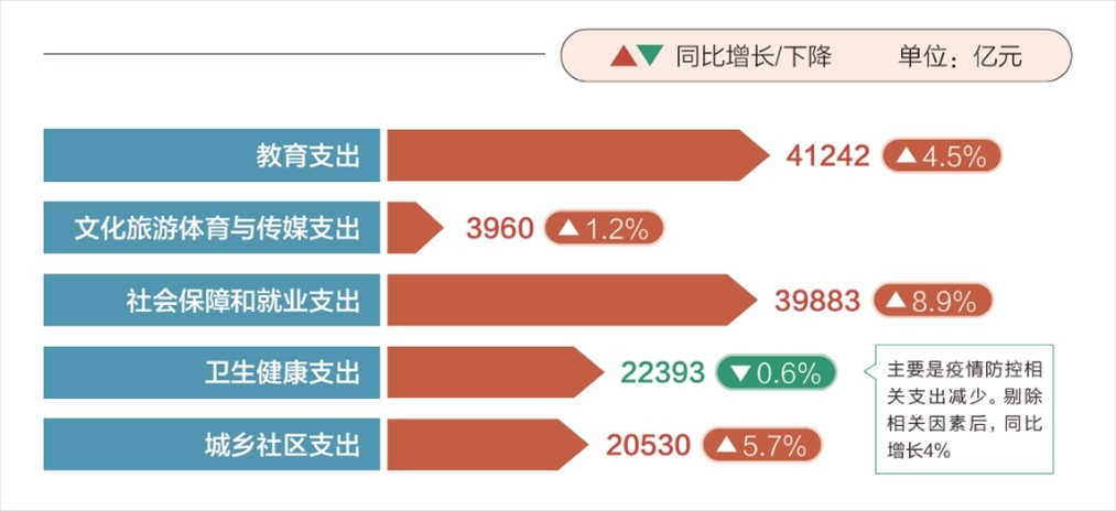 2023年,盡管財政收支壓力很大,但民生投入力度不減。超過27萬億元全國一般公共預(yù)算支出中,教育、社會保障和就業(yè)支出都在4萬億元上下,衛(wèi)生健康、城鄉(xiāng)社區(qū)支出都超過了2萬億元。