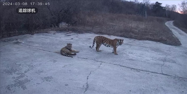 ·吉林延邊四只東北虎在魚(yú)塘旁游蕩,當(dāng)?shù)兀阂淹ㄖ迕褡⒁狻?/span>
