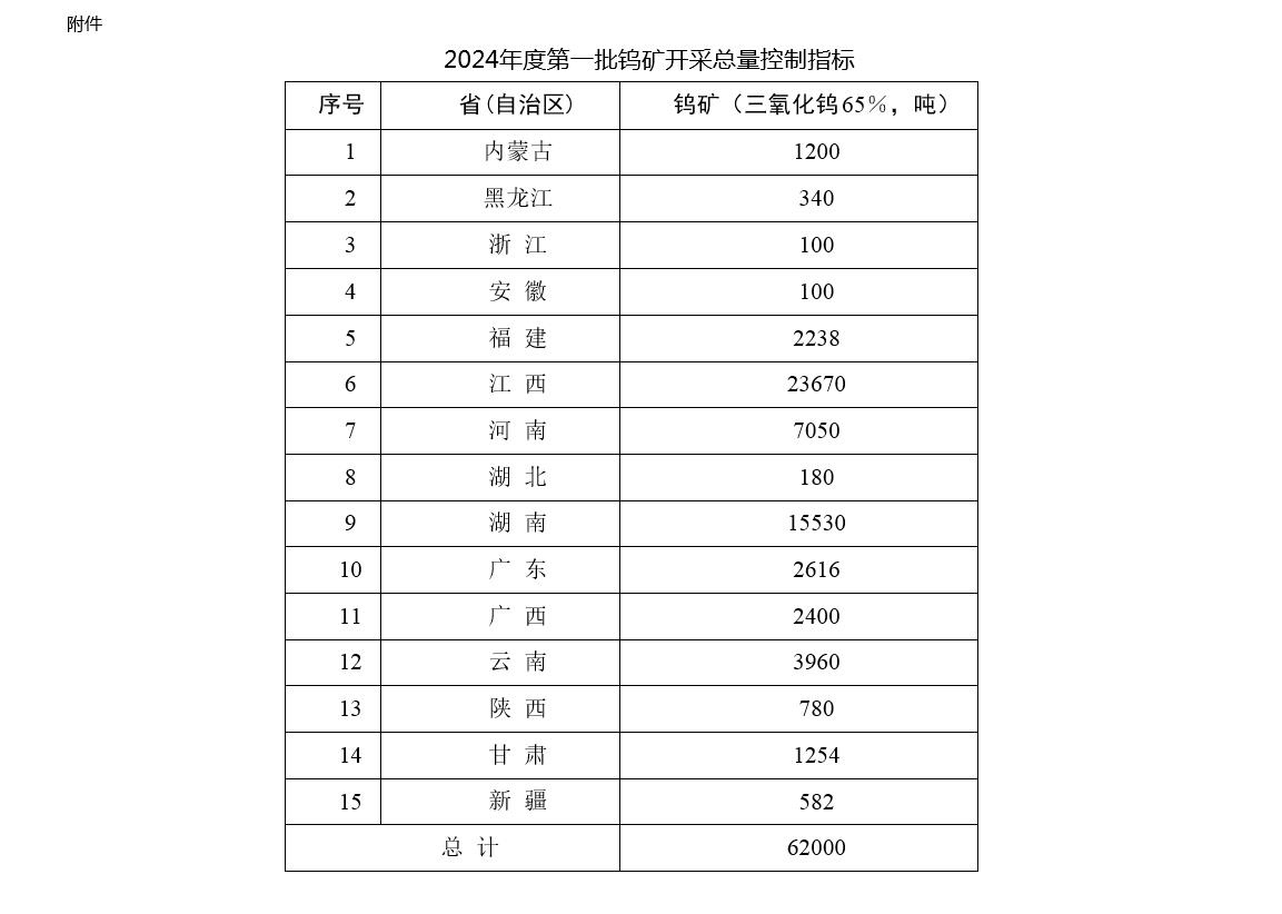 央視網(wǎng)消息:據(jù)自然資源部消息,自然資源部發(fā)布關(guān)于下達(dá)2024年度鎢礦開采總量控制指標(biāo)(第一批)的通知,2024年度第一批鎢礦(三氧化鎢含量65%,下同)開采總量控制指標(biāo)62000噸。鎢礦開采總量控制指標(biāo)不再區(qū)分主采指標(biāo)和綜合利用指標(biāo)。對(duì)采礦許可證登記開采主礦種為其他礦種、共伴生鎢礦的礦山,查明鎢資源量為大中型的,繼續(xù)下達(dá)開采總量控制指標(biāo),并在分配上予以傾斜。對(duì)共伴生鎢資源量為小型的,不再下達(dá)開采總量控制指標(biāo),由礦山企業(yè)向所在地省級(jí)自然資源主管部門報(bào)備鎢礦產(chǎn)量。具體如下:
