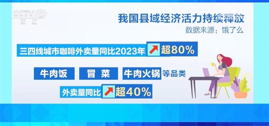今年以來,三四線城市的餐飲消費(fèi)活力持續(xù)釋放。來自某生活服務(wù)平臺(tái)的數(shù)據(jù)顯示,今年開年后,三四線城市咖啡外賣量同比去年增長超過80%,牛肉飯、冒菜、牛肉火鍋等品類外賣量同比增長超過40%。春節(jié)假期期間,三四線城市螺螄粉、甜品、沙拉輕食、咖啡和奶茶果汁等熱門餐食的外賣量更是同比增長超過1倍。