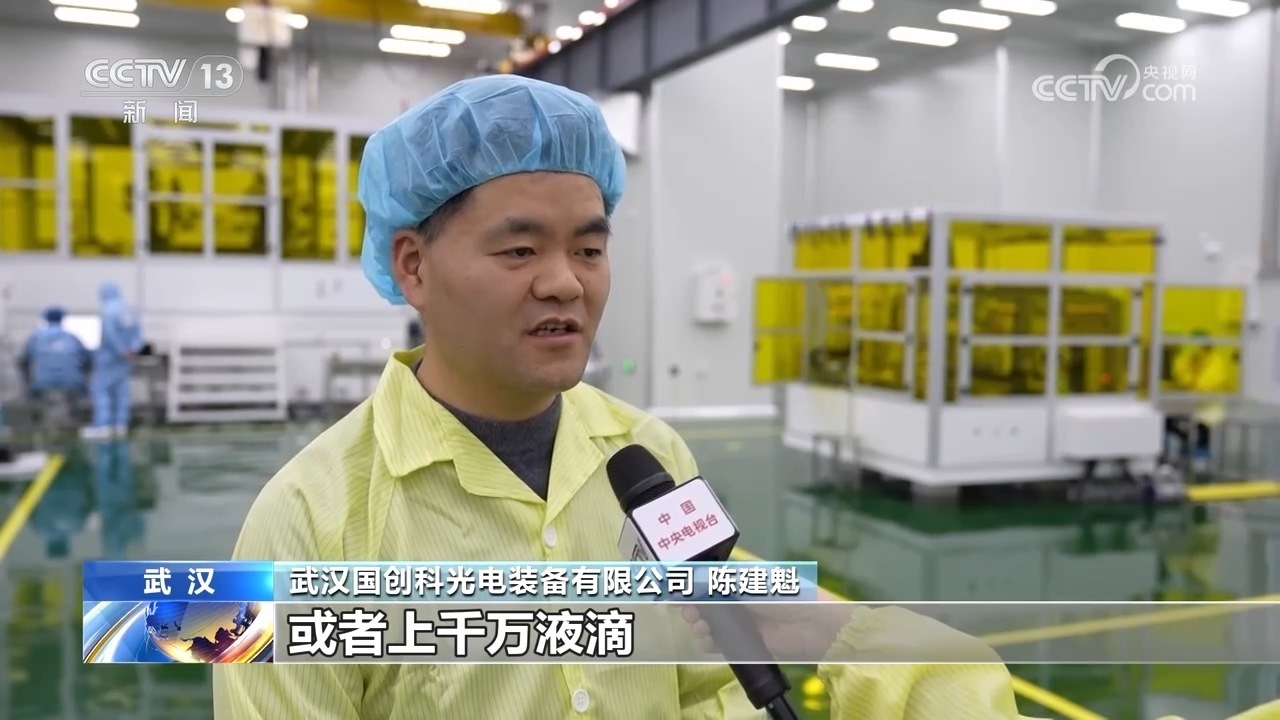 武漢國創(chuàng)科光電裝備有限公司陳建魁介紹,叫做噴墨打印的技術(shù),像我們一個(gè)手機(jī)屏,一個(gè)屏幕上就需要幾百萬個(gè)像素點(diǎn),對應(yīng)的,如果打印的時(shí)候,可能會需要幾百萬或者上千萬液滴。