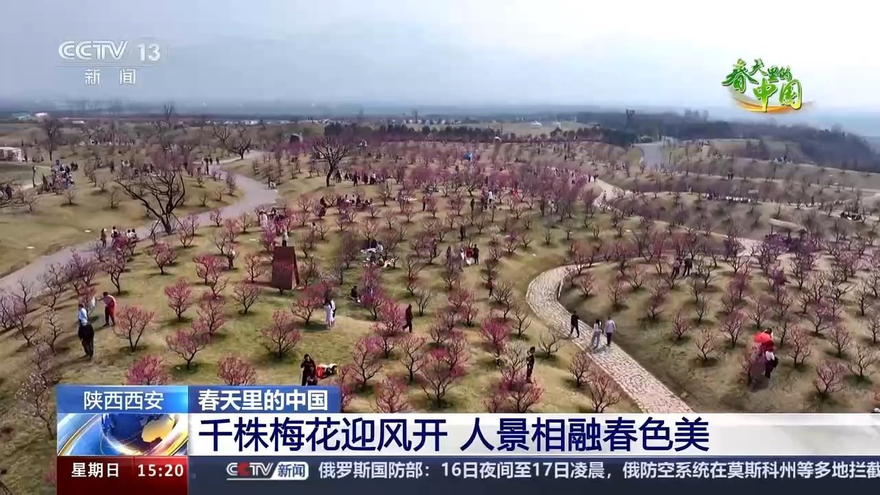 春回大地,踏梅尋香,在陜西秦嶺腳下的西安市長安區(qū)唐村,4000余株梅花迎春綻放,人們在鳥語花香中感受春日浪漫。梅園占地面積50畝,地勢高低起伏,梅樹錯落有致,梅花點綴其中,與不遠處層巒疊嶂的終南山交相輝映,梅花盛開,燦若云霞。游人穿梭在梅園中,人在景中,景映春色,宛若一幅山水田園畫。