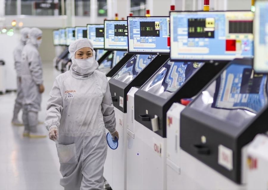 2024年3月14日,在位于重慶市璧山區(qū)的重慶康佳光電科技有限公司,工作人員在商顯MLED生產(chǎn)線上作業(yè)。新華社發(fā)(曾清龍 攝)