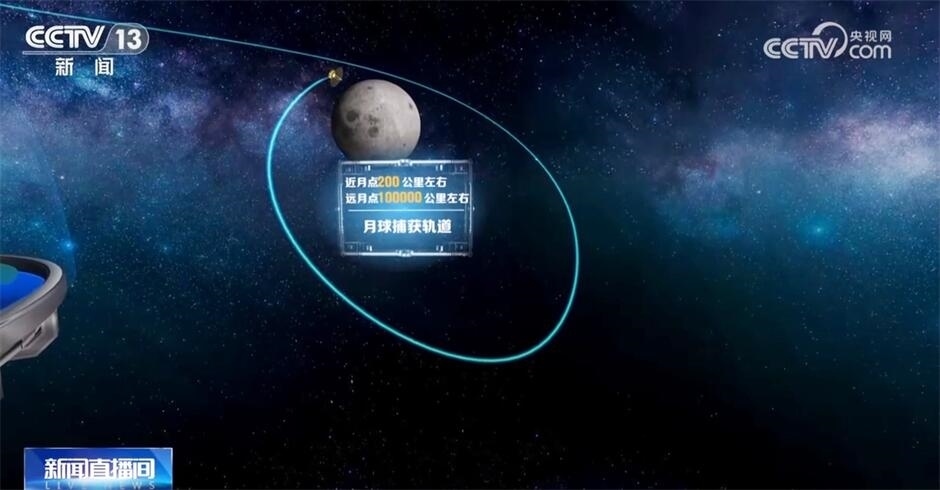 現(xiàn)在,鵲橋二號正在剎車!看,鵲橋二號被月球引力捕獲了!現(xiàn)在,它順利進入了離月球最近點200公里、最遠點10萬公里左右的月球軌道。