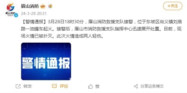 央視網(wǎng)消息:據(jù)眉山消防官微通報,3月28日18時30分,四川眉山消防救援支隊接警,位于東坡區(qū)尚義鎮(zhèn)劉廟路一油罐車起火。接警后,眉山市消防救援支隊指揮中心迅速展開處置。目前,現(xiàn)場火情已被撲滅。此次火情造成兩人輕傷。