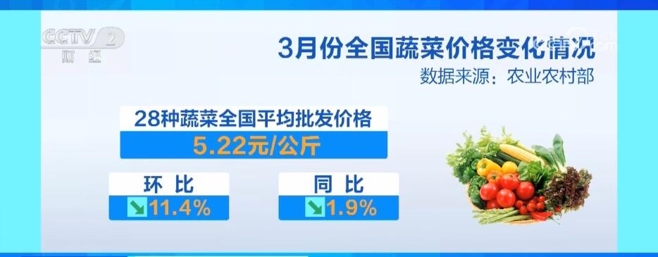 3月份,農(nóng)業(yè)農(nóng)村部監(jiān)測(cè)的28種蔬菜全國(guó)平均批發(fā)價(jià)格為每公斤5.22元,環(huán)比下降11.4%,同比下降1.9%。分品種看,23種蔬菜價(jià)格環(huán)比下降,5種上漲,其中降幅較大的品種有菠菜、黃瓜、生菜和青椒。