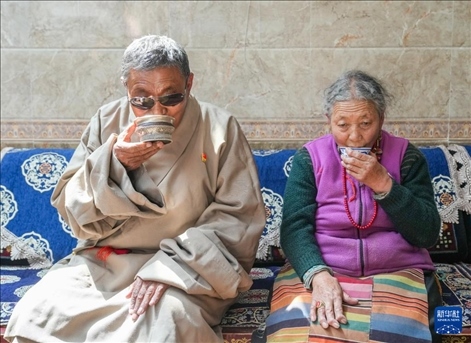 ?白瑪老人(左)和老伴多吉卓瑪在家中喝酥油茶(3月27日攝)。新華社記者 丁汀 攝