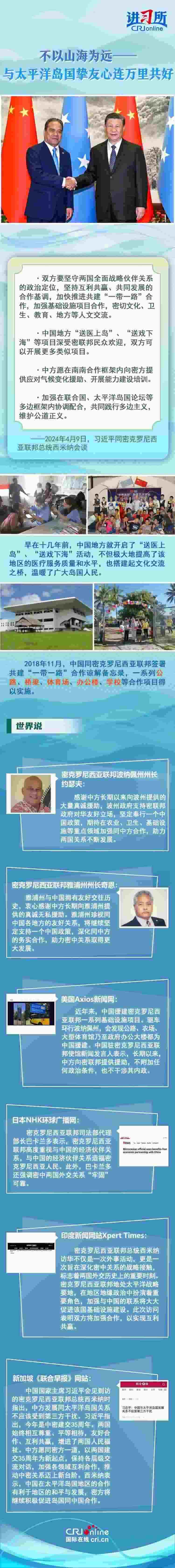 4月9日下午,中國(guó)國(guó)家主席習(xí)近平在北京同密克羅尼西亞聯(lián)邦總統(tǒng)西米納舉行會(huì)談時(shí)表示,每次見(jiàn)到太平洋島國(guó)的朋友,都感到很親切,中國(guó)地方“送醫(yī)上島”、“送戲下?!钡软?xiàng)目深受密聯(lián)邦民眾歡迎,中方愿繼續(xù)為島國(guó)發(fā)展提供力所能及的支持,開(kāi)展三方或多方合作。