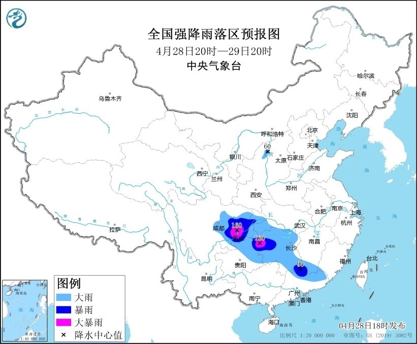 預(yù)計,4月28日20時至29日20時,湖北西南部、湖南大部、江西南部、四川盆地中東部、重慶大部、貴州東部、廣東北部等地部分地區(qū)有大到暴雨,其中,湖南西部、四川盆地東部、重慶東南部和西南部、貴州東北部等地部分地區(qū)有大暴雨(100~160毫米)。上述部分地區(qū)伴有短時強(qiáng)降水(最大小時降雨量30~60毫米,局地可超過80毫米),局地有雷暴大風(fēng)或冰雹等強(qiáng)對流天氣。
