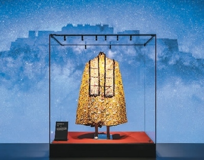 走進(jìn)展廳,在星空璀璨的布達(dá)拉宮夜景映襯下,一件金燦燦的斗篷格外引人注目。斗篷是西藏地區(qū)常見的服裝,根據(jù)場合和穿著對象的不同,斗篷的式樣和用料均有所差別。這件金寶地花卉紋斗篷通長170厘米,黃綢緞上繡滿了花紋圖案,并鑲有多種珠寶,衣領(lǐng)上縫有獺皮,背后繡有云龍紋,可想而知穿著者身份之顯赫。此次展覽是它首次公開展出。