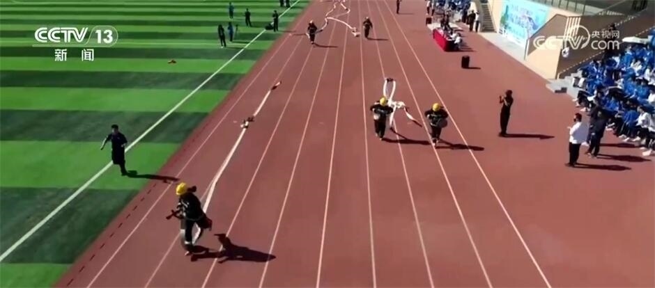 發(fā)令員一聲哨響,幾名消防員手持水槍水帶,飛快向前沖出。這是在山東濟寧某中學(xué)舉行的首屆“消防安全運動會”上,消防員模擬救援現(xiàn)場進行的四百米五帶三槍操法展示。