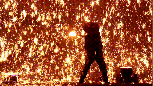 夜幕中,八達嶺長城流光溢彩。舉目望去,流火似金,濺星如電。但見匠夫一揮臂,沖天鐵花飛寰宇。千萬點,夜放花千樹,天地間。