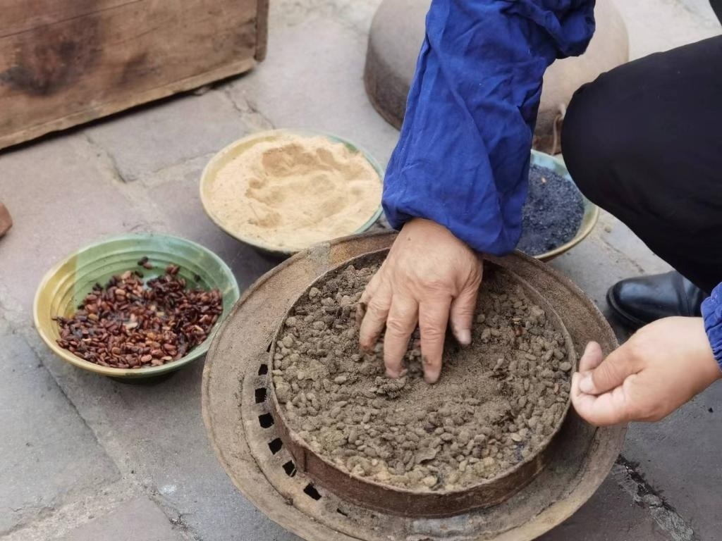 沖好針孔,便在磨石上反復銼尖。隨后倒入熱鍋里翻炒,再舀入一瓢水,針的剛性和硬度由此增加。接下來便輪到三大碗“大陽秘方”登場:白崖土粉末、松木炭和發(fā)酵后的豆豉,用于蒸針?!八赡咎靠梢栽黾愉撫樀暮剂浚嵘捕?;豆豉增加亮度;白崖土粉末作為分散劑讓針受熱均勻。這樣處理后可以保證針質(zhì)更堅硬又有光澤?!?/p>